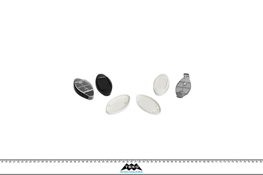 Ergonomisch geformtes Kunststoffgehäuse mit einer eingelassenen Fläche zur Aufnahme von Folientastaturen. Matte Oberfläche. Volumen für 12V- Rundzelle oder 3V Knopfzelle. Das Modell „OVO2-IR“ hat einen LED-Vorderausschnitt. Verschluß mit zwei Schrauben.
