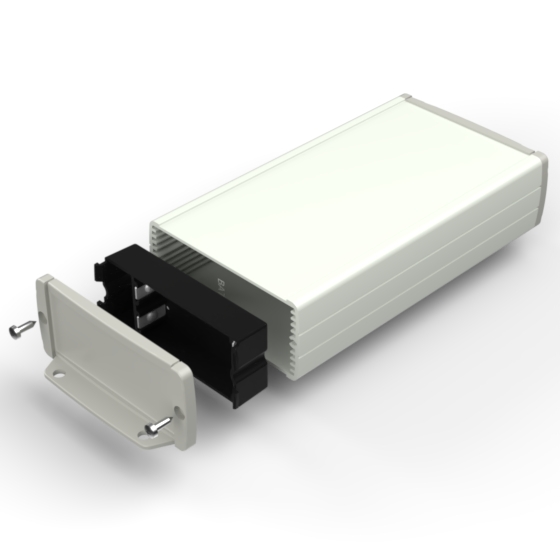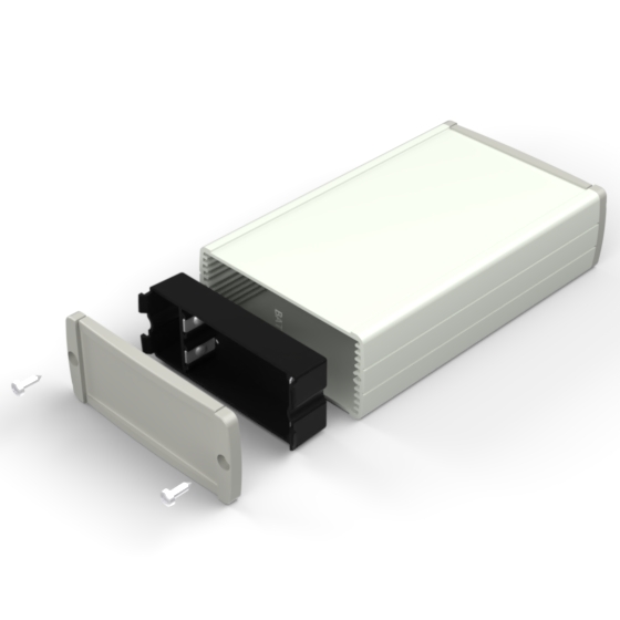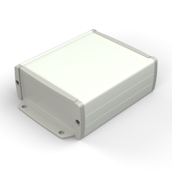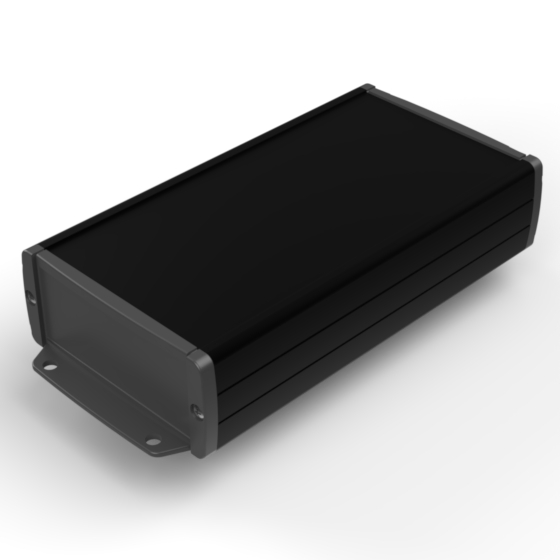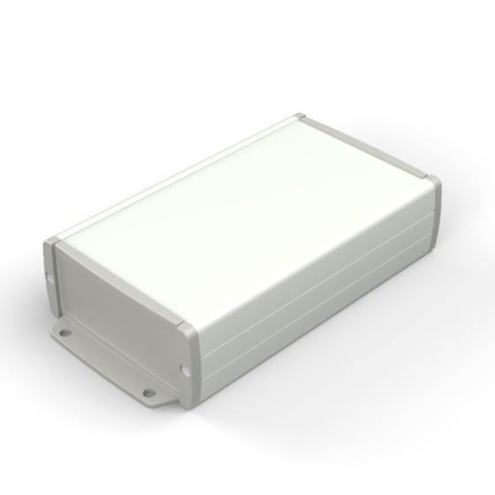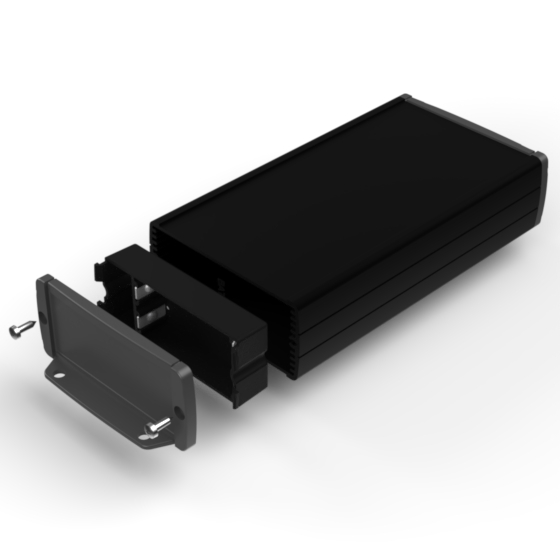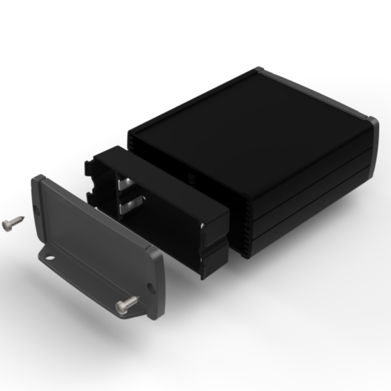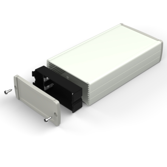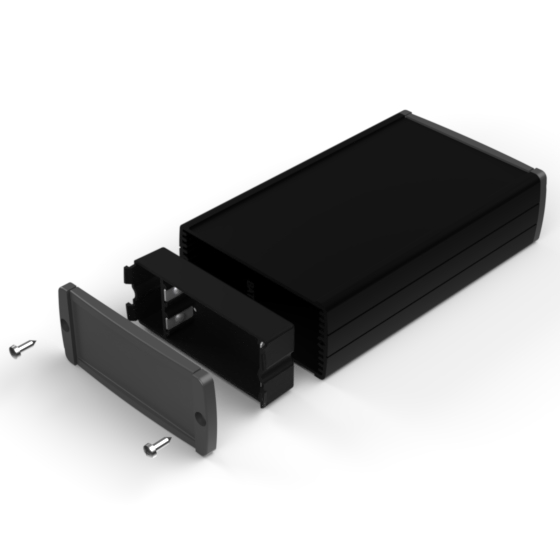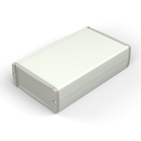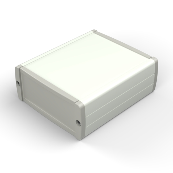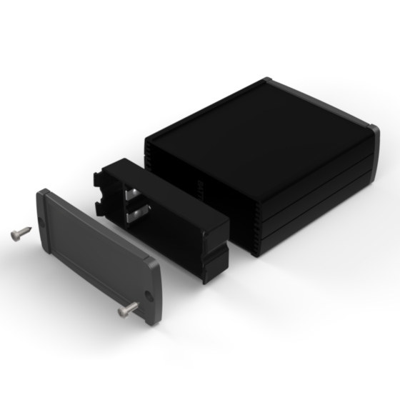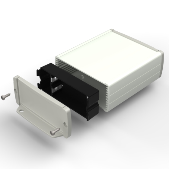 Extruded aluminium cases with high quality painted finishing. Two ABS front panels, internal slots for PCB’s and a recessed area for a keypad membrane. The model with “-B” has a battery compartment for two 1,5V mignon-cells (AA) or one 9V battery (PP3). Twelve standard models are available with different sizes. Closing by four screws.