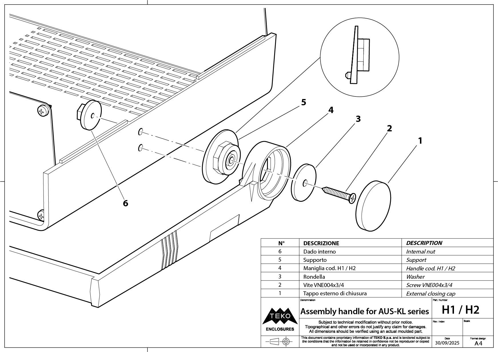 ABS enclosures with a handle that can be locked in any of eight positions and used as a stand. Vented cover and base for aeration. Front and rear 1 mm aluminium panels. Each half-shell has integral PCB guides and mounting studs. Matt surface finish. Closing by eight screws.