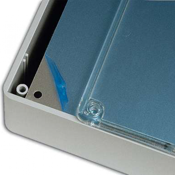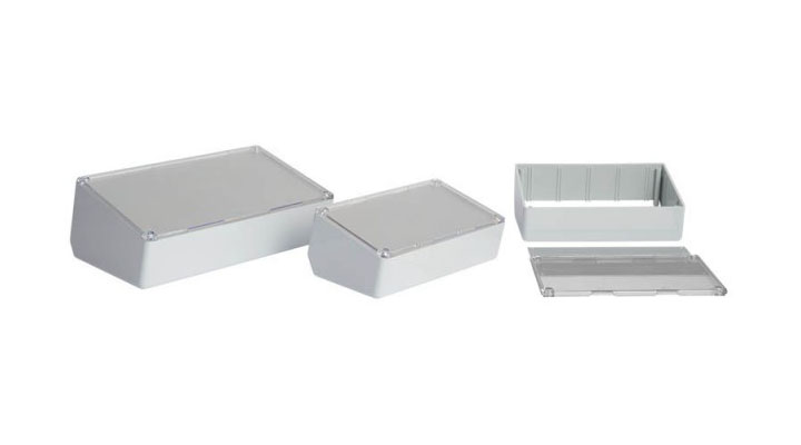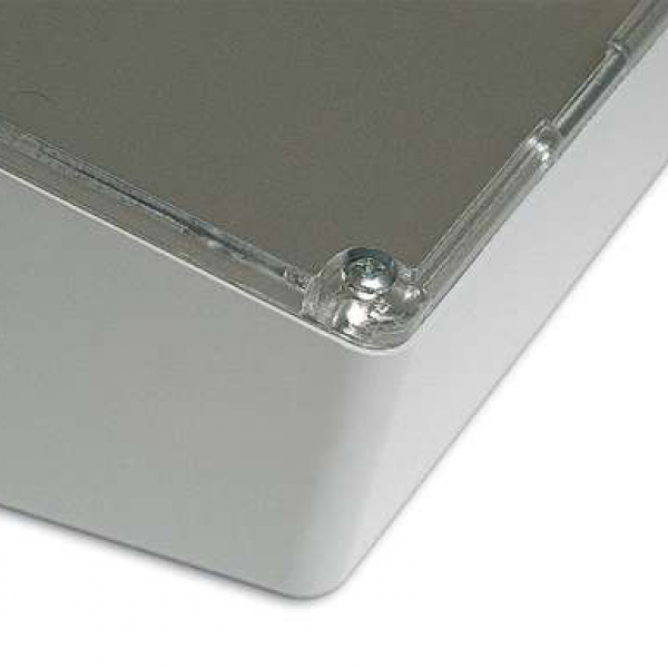 ABS enclosure with a 15° inclined transparent polycarbonate cover that protects an anodised 0.5 mm aluminium panel. The base walls have integral PCB guides and mounting studs. Rounded corners. Glossy surfaces finish. Closing by four screws.