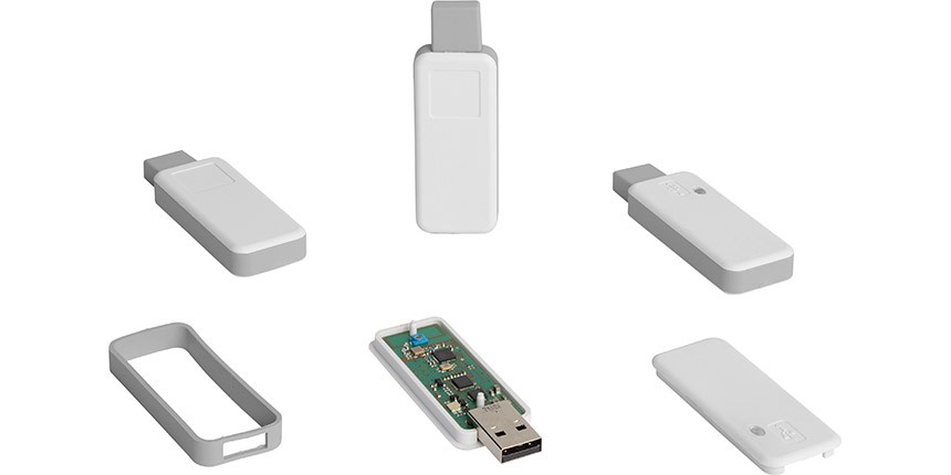 Piccolo contenitore dal design minimale adatto a molteplici applicazioni di dispositivi USB come dongle, pendrive e trasmettitori Wireless. Fondo e coperchio con chiusura a scatto completati da un anello perimetrale in materiale morbido e un cappuccio di protezione per il connettore. Guidaluce per LED sul coperchio per monitorare lo stato del dispositivo. Area ribassata sul fondo per etichette o marcatura laser. Versione standard colore bianco/grigio chiaro. Colorazioni custom per adeguarsi ai colori aziendali del cliente a partire da un minimo di 500 pezzi.